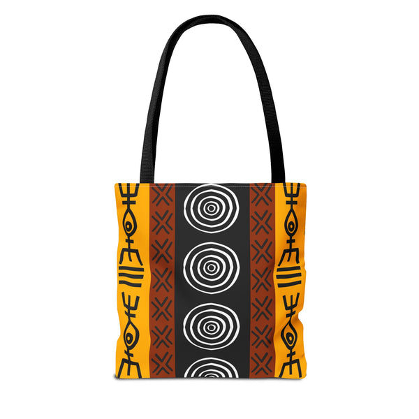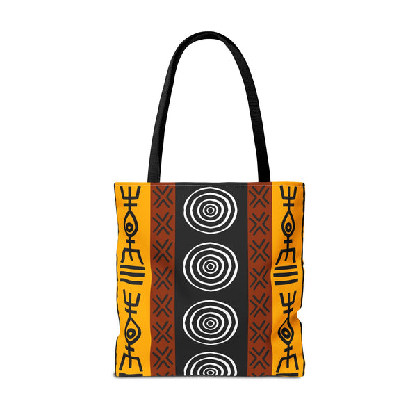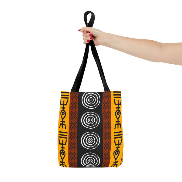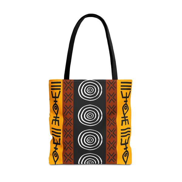 This bold tote brings a slice of African tribal design into everyday life. The graphic print feels alive — geometric lines and striking shapes that move with you through the market, studio, or city streets. It carries groceries, sketchbooks, and plans with confidence, while the roomy boxed corners give practical space for the things you actually use. The reinforced handles and durable polyester body mean this bag stands up to daily rhythm, rain, and repeat trips. Choose your handle color to make it yours, and let the strong, graphic pattern do the talking when you walk into a gathering, craft fair, or weekend market. Product features - Durable 100% polyester body that retains shape and dries quickly - Reinforced double-stitched handles for reliable carrying strength - Boxed corners for extra interior room and better load distribution - Matching/transparent seam stitching and non-woven laminated interior for neatness and structure - Available in three sizes with five handle color options; size tolerance ±0.75" (1.9 cm) Care instructions - Remove all items from the bag before cleaning. Suggested to pretreat visible stains with stain remover. Mix warm water with laundry detergent and clean the bag with terry washcloth or a soft bristle brush. Let the bag air dry.