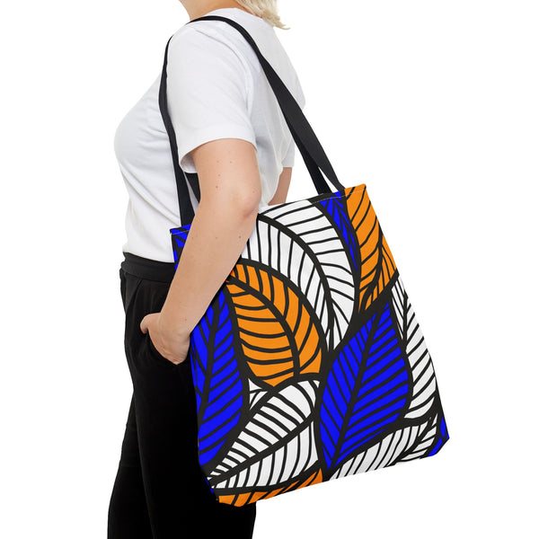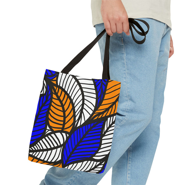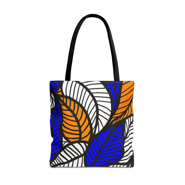 This blue Ankara floral print tote brings bold West African patterns into everyday carry. The saturated blues and intricate floral motifs pop against a clean, structured silhouette, making the bag feel lively without being loud. It’s roomy enough for market runs, library trips, or a spontaneous day out—boxed corners open up usable space while the reinforced handles stand up to heavy loads. The interior laminate keeps contents stable, and the quick-dry polyester body means this tote bounces back from rain or spills. Choose one of five handle colors to match your style and let this bag be the bright, practical accent that travels with you from errands to afternoons at the café. Product features - Durable 100% polyester body — holds shape and dries quickly - Reinforced double-stitched handles for extra strength - Boxed corners for expanded interior capacity - Non-woven laminated interior with a single large compartment - Five handle color choices; available in three sizes (size tolerance ±0.75\"/1.9 cm) Care instructions - Remove all items from the bag before cleaning. Suggested to pretreat visible stains with stain remover. Mix warm water with laundry detergent and clean the bag with terry washcloth or a soft bristle brush. Let the bag air dry.
