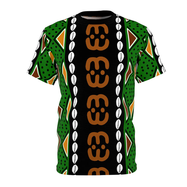 A green mudcloth–inspired tee that feels like a quiet walk through a sun-dappled market. The hand-drawn geometric motifs and earthy green tones bring a thoughtful, grounded energy to a casual wardrobe. Lightweight and breathable, it layers easily under a jacket or stands alone on warmer days. The pattern reads artisanal rather than loud — it’s the kind of piece someone who cares about craft reaches for when they want to feel calm, intentional, and a little adventurous. Wear it to a weekend market, a slow coffee meet-up, or while sketching in the park; the design settles into daily life with warm familiarity.