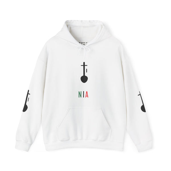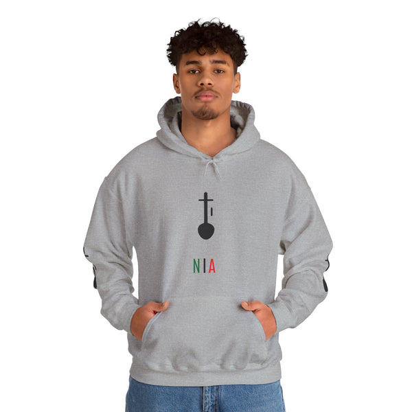 Nia (Purpose), the fifth day of Kwanzaa. To make our collective vocation the building and developing of our community in order to restore our people to their traditional greatness. This unisex heavy blend hooded sweatshirt is relaxation itself. Made with a thick blend of cotton and polyester, it feels plush, soft and warm, a perfect choice for any cold day. In the front, the spacious kangaroo pocket adds daily practicality while the hood's drawstring is the same color as the base sweater for extra style points. Made with a medium-heavy fabric (8.0 oz/yd² (271 g/m²)) that consists of 50% cotton and 50% polyester for that cozy feel and warmth you need in a hoodie. The classic fit along with the pouch pocket and the tear-away label make for a highly comfortable, scratch-free wearing experience. The color-matched drawcord and the double-lined hood add a stylish flair and durability that tie everything together. Made using 100% ethically grown US cotton. Gildan is also a proud member of the US Cotton Trust Protocol ensuring ethical and sustainable means of production. The blank tee's dyes are OEKO-TEX-certified dyes with low environmental impact. Fabric blends: Heather Sport colors - 60% polyester, 40% cotton