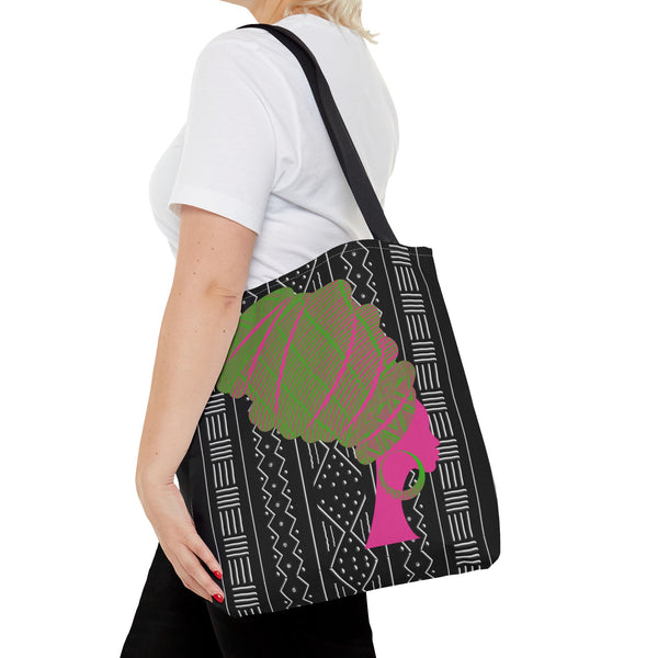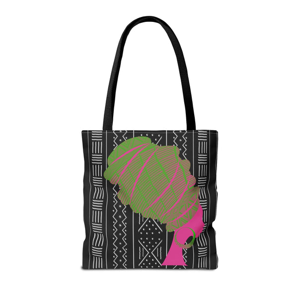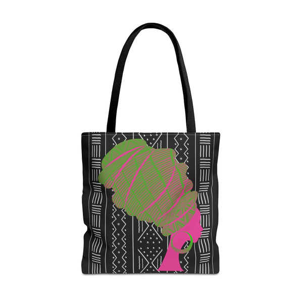 A soft-structured tote inspired by traditional mudcloth patterns, reimagined in cheery pinks and leafy greens. The roomy silhouette and boxed corners give it everyday utility—carry groceries, notebooks, or a light market haul without things sagging or losing shape. The reinforced handle stitching and medium-weight polyester hold up to daily wear, while the subtle black inner seams and laminated interior keep things neat and easy to wipe clean. It feels lively and handmade, a bright companion for market mornings, park afternoons, or bringing a splash of pattern to your daily routine. Product features - Durable 100% polyester body that holds shape and dries quickly - Reinforced double-stitched handles for extra strength - Boxed corners for expanded interior capacity - Non-woven laminated interior with easy-clean lining - Available in three sizes with five handle color options Care instructions - Remove all items from the bag before cleaning. Suggested to pretreat visible stains with stain remover. Mix warm water with laundry detergent and clean the bag with terry washcloth or a soft bristle brush. Let the bag air dry.