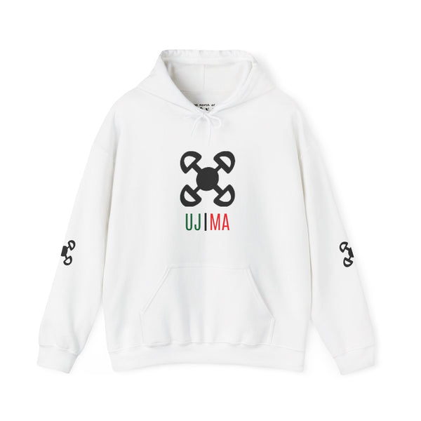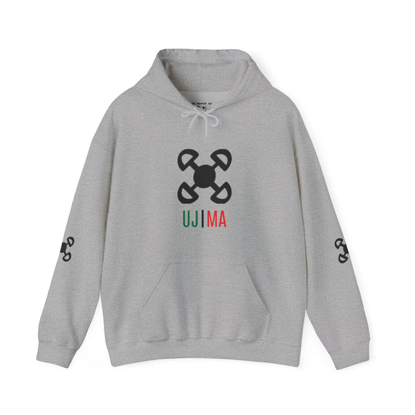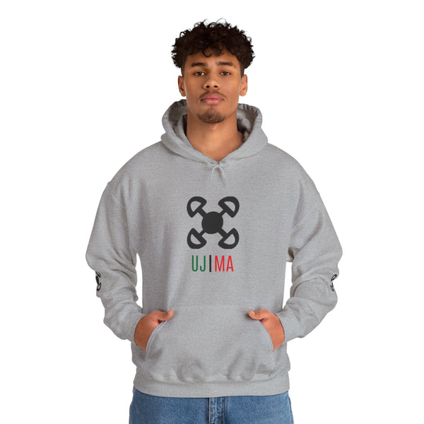 Ujima (Collective Work and Responsibility) is the third day of Kwanzaa. To build and maintain our community together and make our brother's and sister's problems our problems and to solve them together. This unisex heavy blend hooded sweatshirt is relaxation itself. Made with a thick blend of cotton and polyester, it feels plush, soft and warm, a perfect choice for any cold day. In the front, the spacious kangaroo pocket adds daily practicality while the hood's drawstring is the same color as the base sweater for extra style points. Made with a medium-heavy fabric (8.0 oz/yd² (271 g/m²)) that consists of 50% cotton and 50% polyester for that cozy feel and warmth you need in a hoodie. The classic fit along with the pouch pocket and the tear-away label make for a highly comfortable, scratch-free wearing experience. The color-matched drawcord and the double-lined hood add a stylish flair and durability that tie everything together. Made using 100% ethically grown US cotton. Gildan is also a proud member of the US Cotton Trust Protocol ensuring ethical and sustainable means of production. The blank tee's dyes are OEKO-TEX-certified dyes with low environmental impact. Fabric blends: Heather Sport colors - 60% polyester, 40% cotton